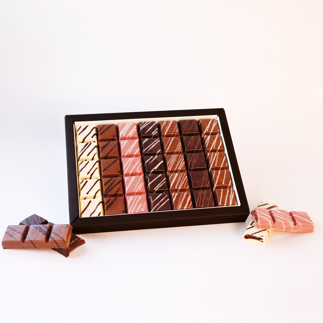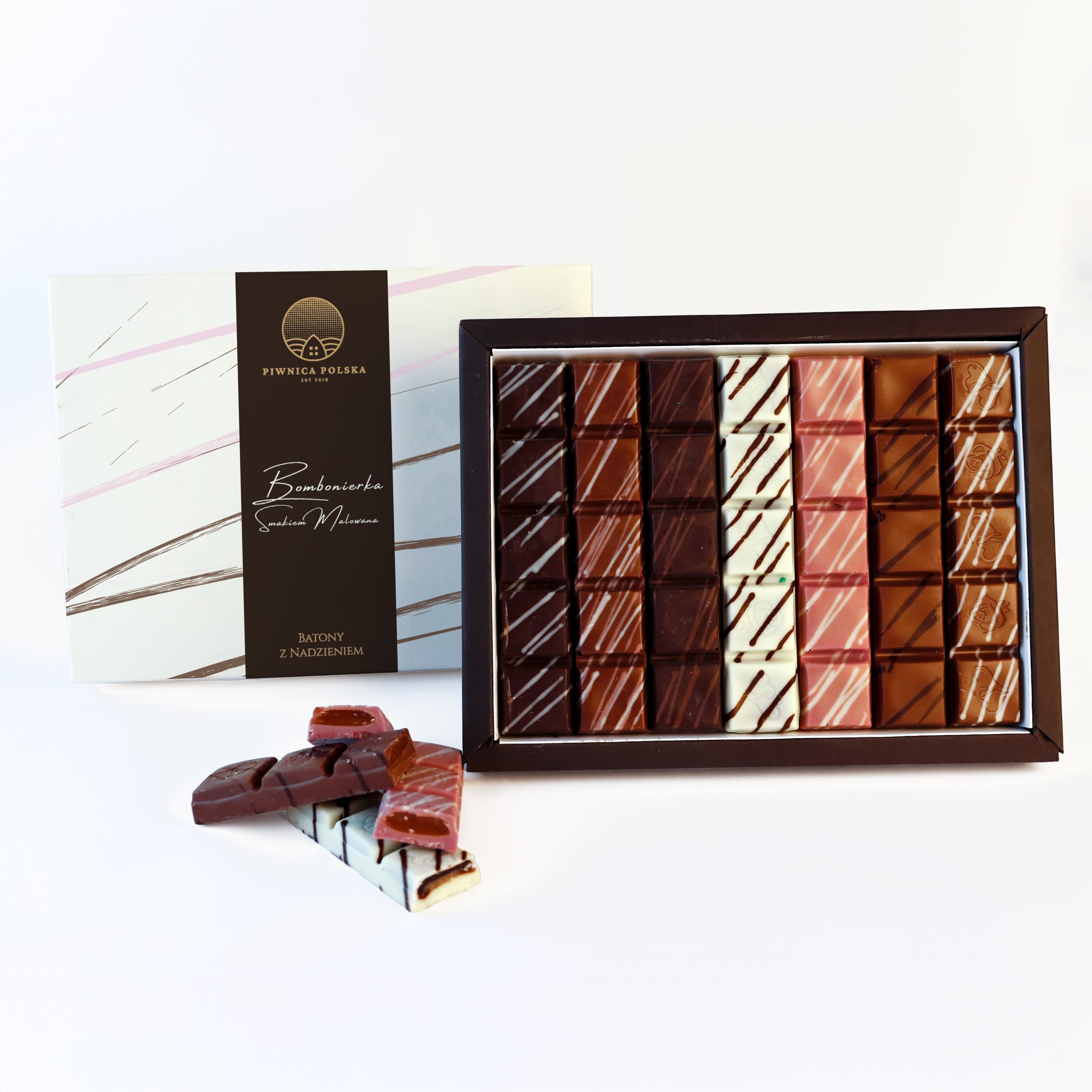 Ekskluzywne praliny w formie batonów – zestaw 7 sztuk. Wyrafinowany smak i eleganckie opakowanie – idealne na prezent biznesowy lub upominek.