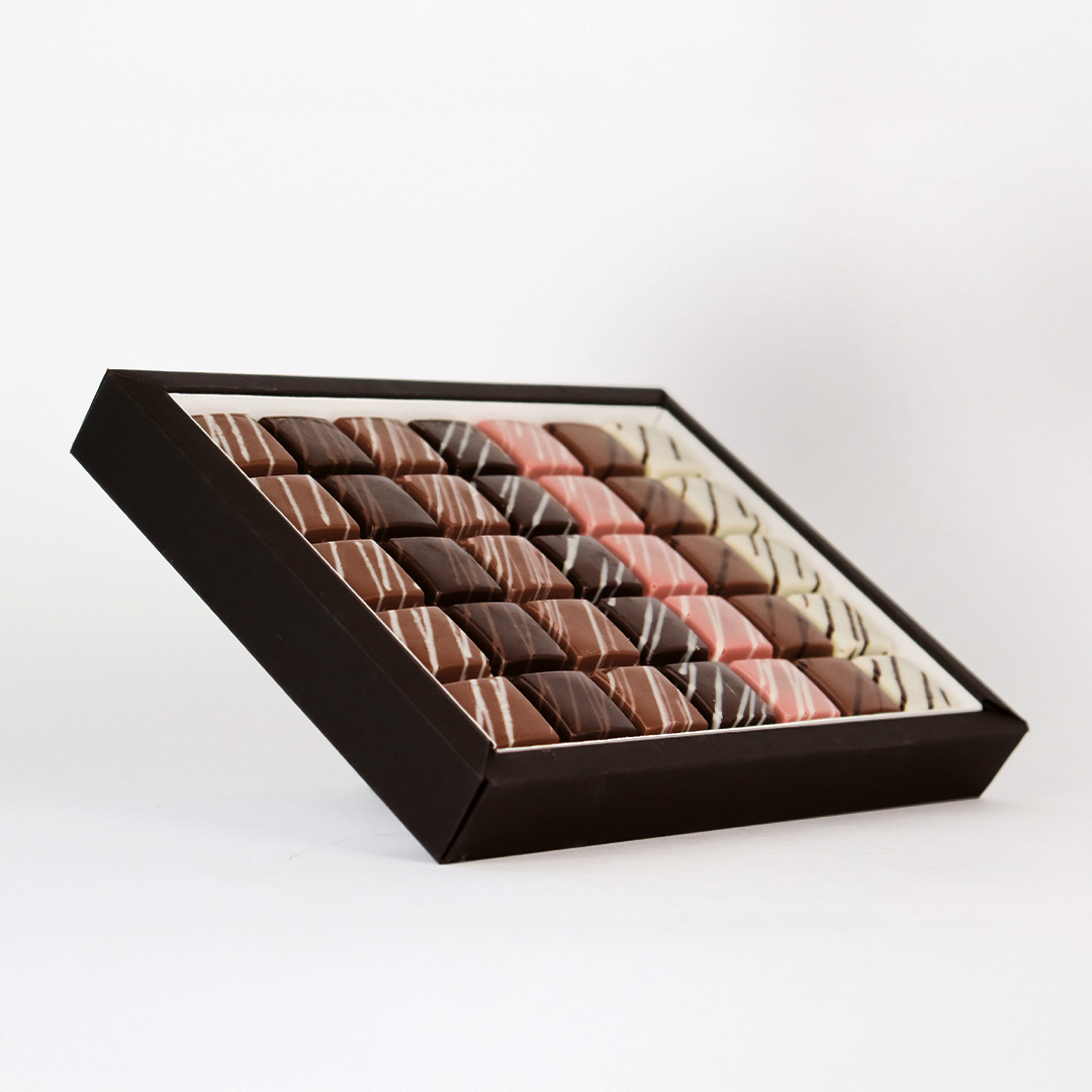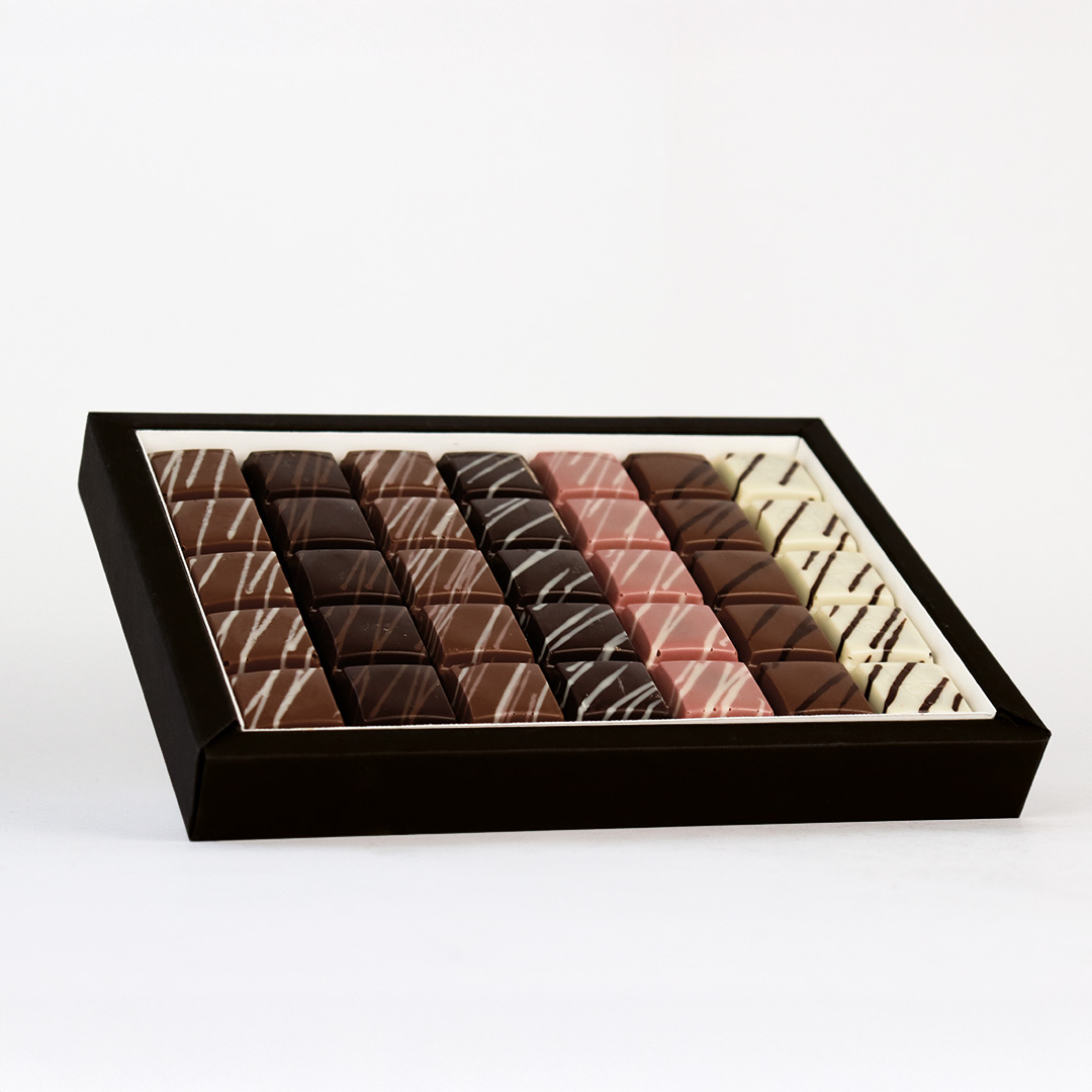 Każda z pralin zachwyca formą – lśniąca powierzchnia, ręcznie nanoszone dekoracje, wyczuwalne w strukturze różnice pomiędzy warstwami nadzienia. Wśród nich znajdziesz również unikalny batonik z czekolady rubinowej, który nie tylko urzeka swoim naturalnym różowym kolorem, ale także subtelnie owocowym, jagodowym posmakiem. To nowoczesny akcent w klasycznej formie, który zaskakuje i zachwyca.