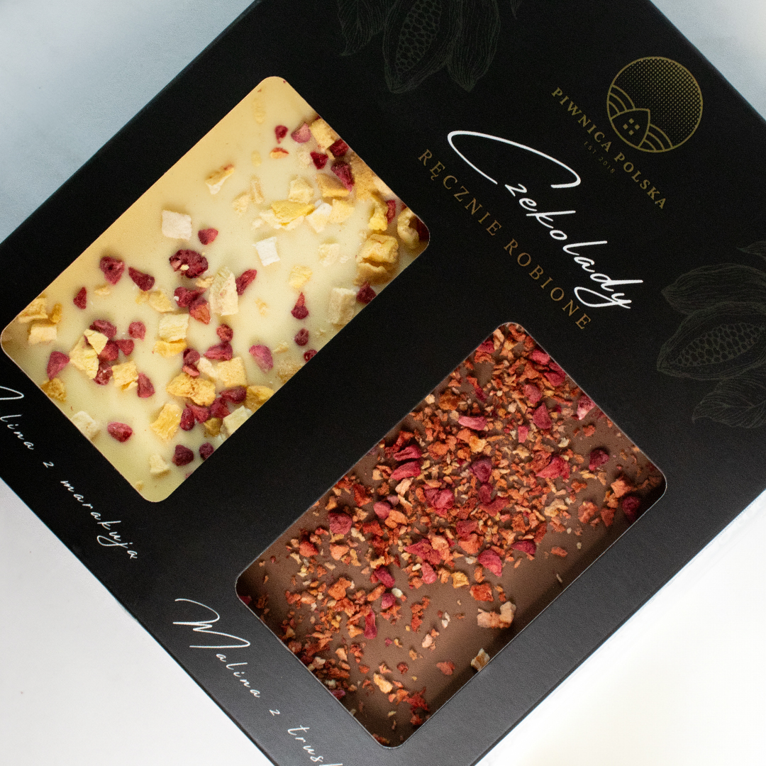 Zamów już teraz nasz Dwupak Czekolady Białej i Mlecznej z Liofilizowanymi Owocami i rozkoszuj się wyjątkowym smakiem, który przywołuje wspomnienia i tworzy nowe, niezapomniane chwile. Marka Piwnica Polska zaprasza Cię do odkrycia czekoladowego raju w eleganckim opakowaniu.\