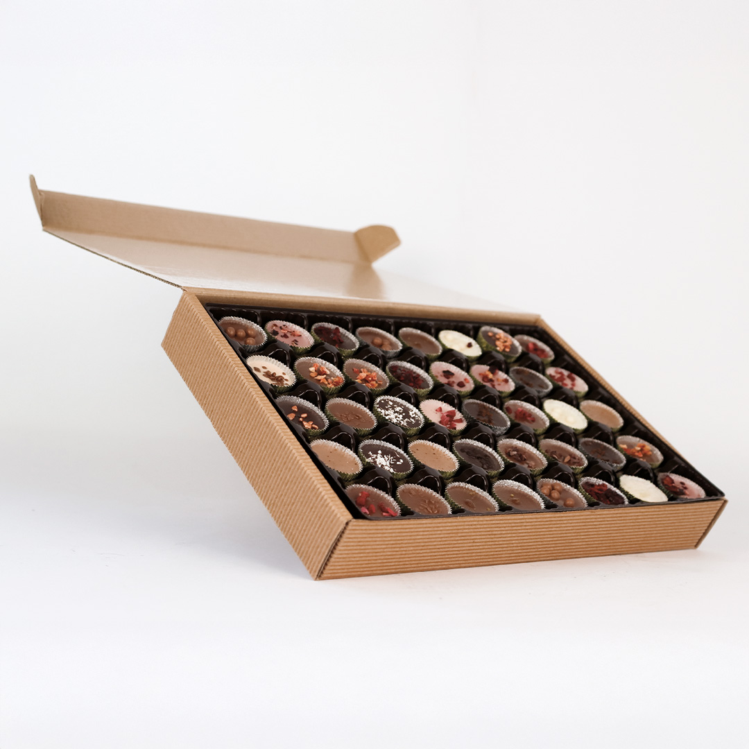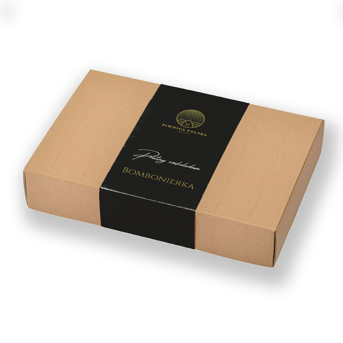 Zestaw pakowany jest w eleganckie pudełko z możliwością personalizacji (np. tłoczenie logo, banderola z brandingiem). Każda pralina jest oddzielnie umieszczona w złotym kubeczku, co zapewnia nie tylko higienę i świeżość, ale również elegancki wygląd przy serwowaniu – na eventach, targach, spotkaniach z klientami.