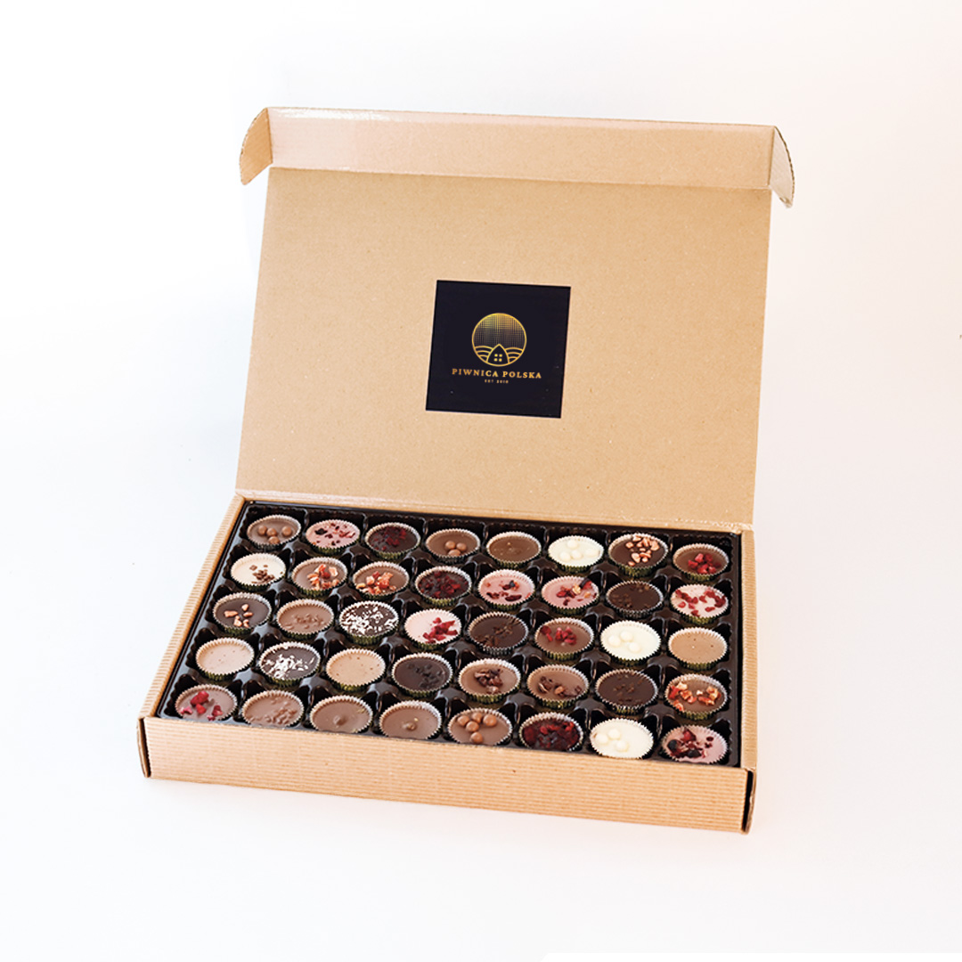 W zestawie znajduje się 40 pralin w 20 unikalnych smakach, po 2 sztuki z każdego rodzaju. Dzięki temu możesz dzielić się nimi z bliskimi lub degustować samodzielnie – odkrywając stopniowo różnorodność aromatów i konsystencji.