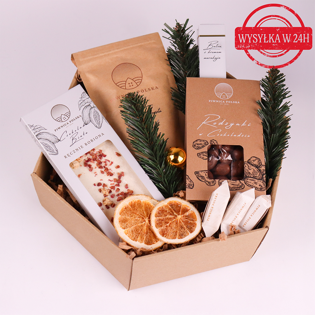 W centrum tej słodkiej kompozycji znajduje się ręcznie robiona biała czekolada z maliną i marakują – lekka, kremowa i niezwykle aromatyczna. Towarzyszą jej rodzynki w czekoladzie o głębokim smaku, delikatny baton wypełniony egzotycznym kremem marakuja oraz aromatyczna kawa, która doskonale przełamuje słodycz zestawu. Dodatkiem, który nadaje całości domowego, przytulnego charakteru, są tradycyjne krówki zapakowane pojedynczo. Estetyczne, sześciokątne opakowanie w stylu eko sprawia, że zestaw jest gotowy do wręczenia bez konieczności dodatkowego pakowania.
