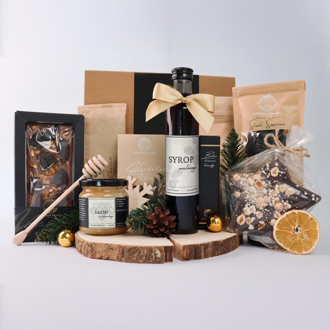 W zestawie znajdują się polskie produkty spożywcze najwyższej jakości, zamknięte w estetycznym, świątecznym opakowaniu. Ręcznie robione praliny, miód, aromatyczna herbata, świeżo palona kawa i świąteczne wypieki tworzą prawdziwą ucztę smaków. To propozycja, która łączy tradycję z elegancją, a bogata zawartość sprawia, że zestaw robi duże wrażenie i podkreśla wagę relacji, które chcesz pielęgnować.